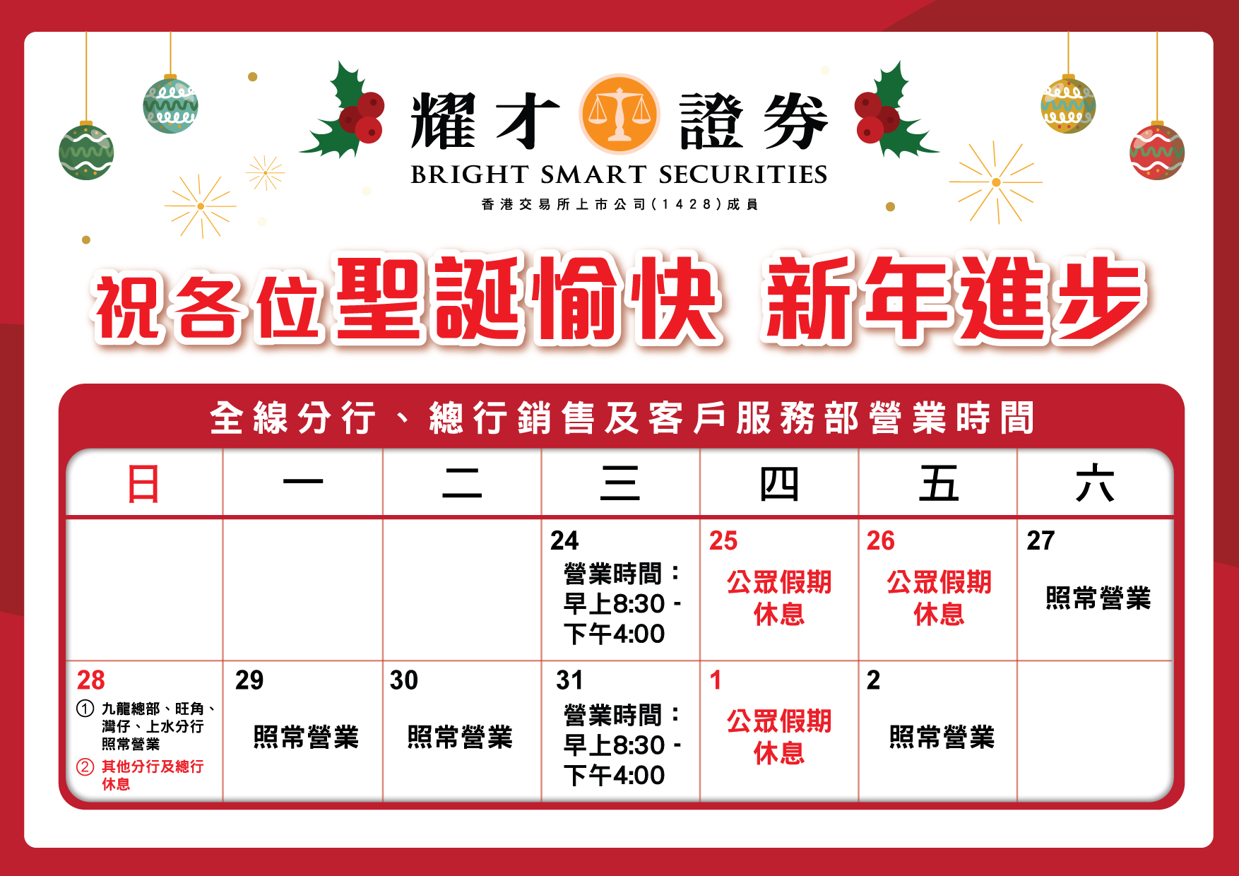 由於聖誕節前夕 (20251224及新年前夕 (20251231),香港交易所均不設下午交易時段,本集團全線分行,總行銷售及客戶服務部營業時間如下: