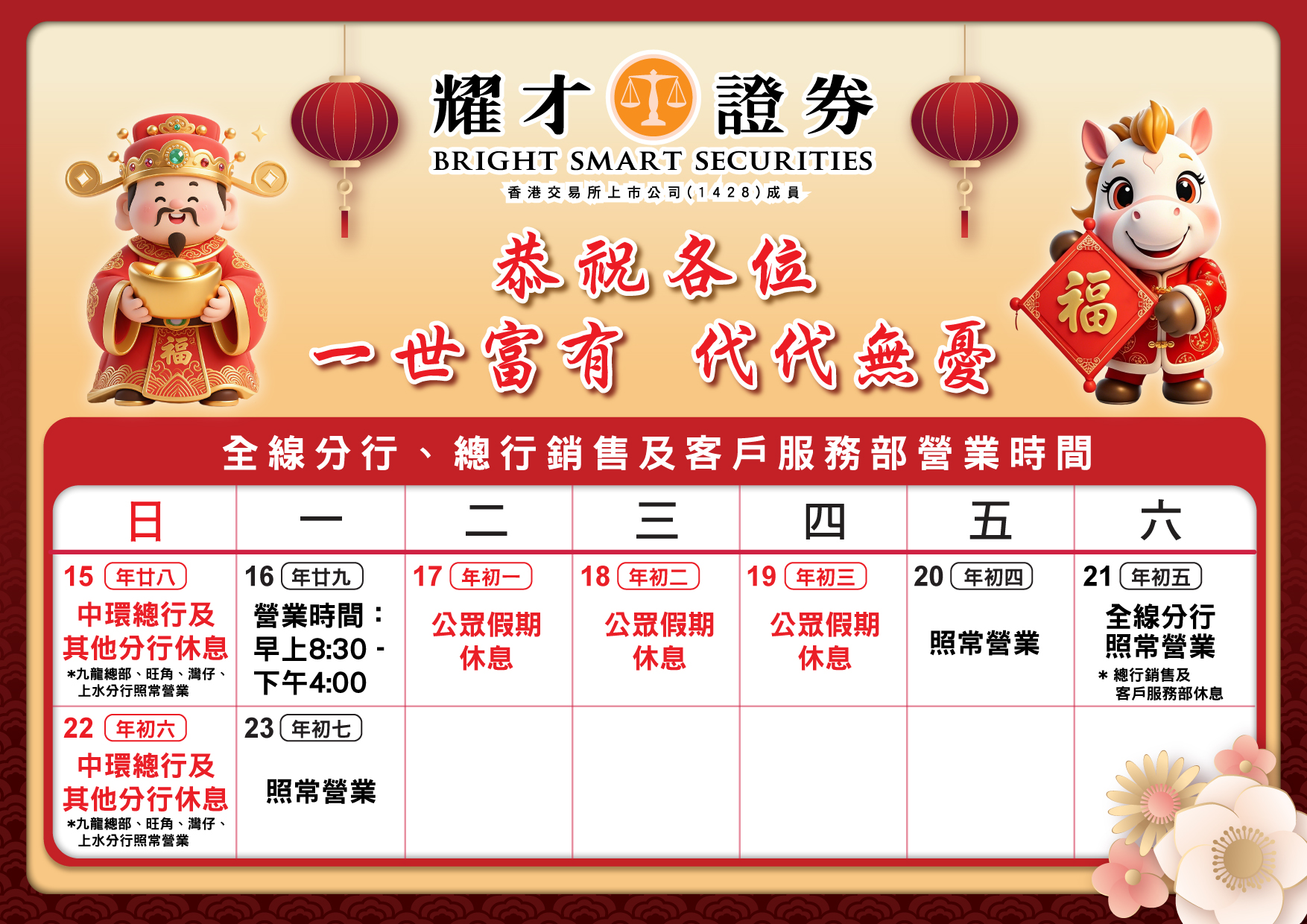 由於農曆新年前夕 (2026年2月16日) 香港交易所不設下午交易時段,本集團全線分行,總行銷售及客戶服務部營業時間如下: